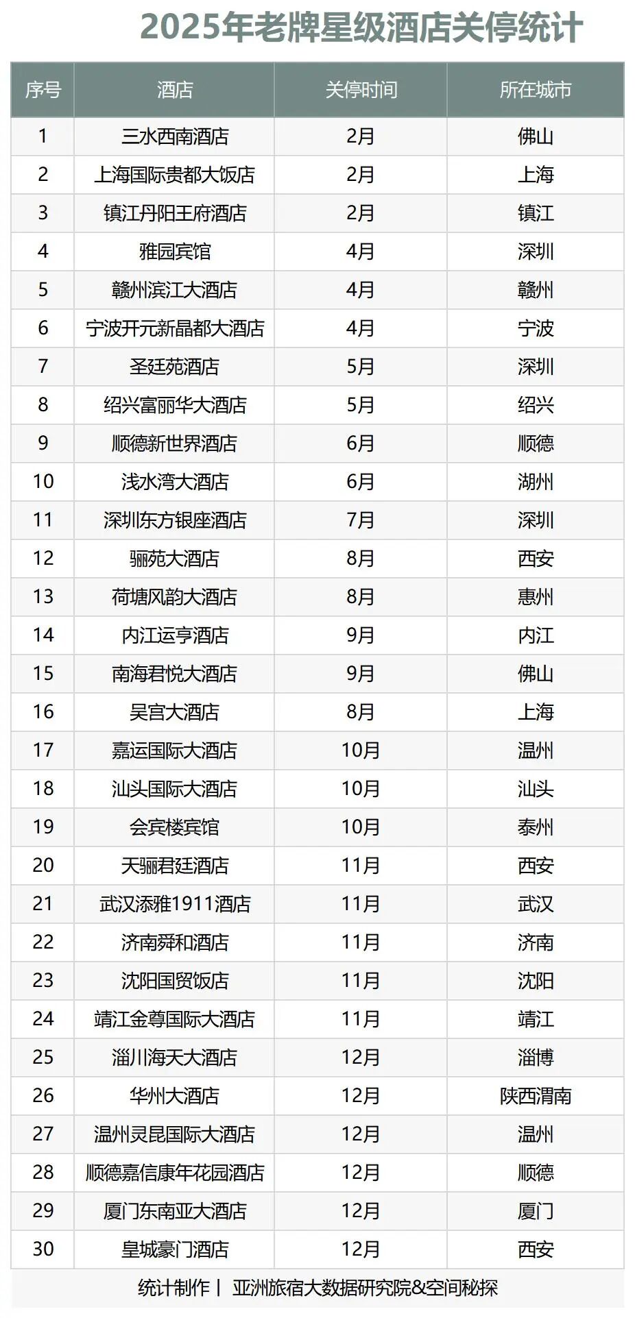 据亚洲旅宿大数据研究院(ABNData)不完全统计,近三个月以来,全国各地已有至少14家四星级以上老酒店关停;而2025年年初至今,这一数字已升至30家。