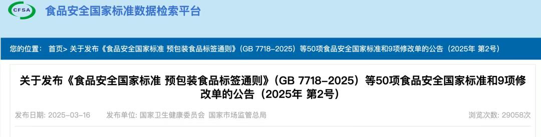2025年3月27日,国家卫生健康委会同国家市场监督管理总局发布50项食品安全国家标准和9项标准修改单。