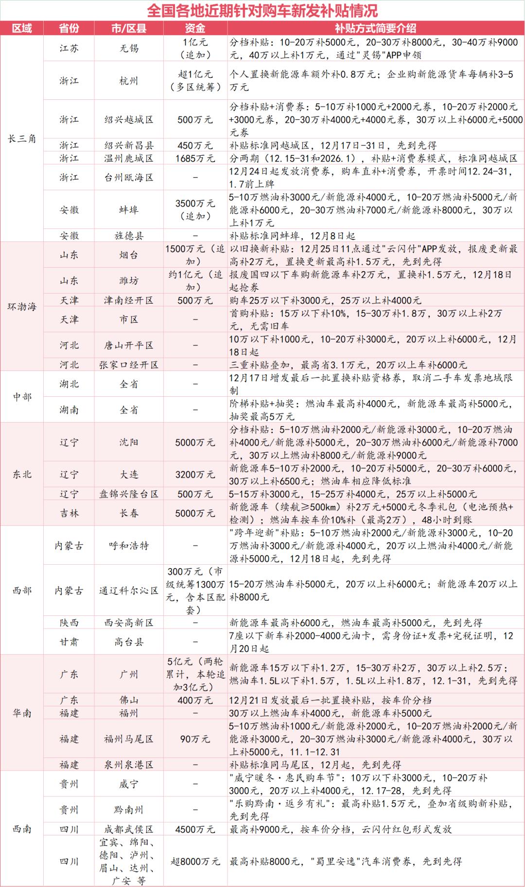 广州追加3亿元、无锡加码1亿元、潍坊再新增1亿补贴……近期,全国各地至少有超过30个城市密集抛出大额购车补贴,为年末车市注入强心剂。