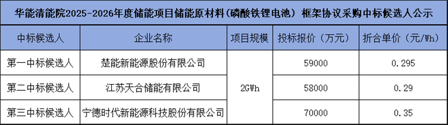 华夏能源网注意到,12月10日,中国华能公布了华能清能院2025-2026年度储能框采候选人结果。其中,1GW/2GWh储能电池框采,要求单体电池容量不低于314Ah。最终,楚能新能源、天合储能、宁德时代(SZ:300750)三家企业入围,报价分别为0.295元/Wh、0.29元/Wh、和0.35元/Wh,前两名的报价均处于电芯价格年内低点。