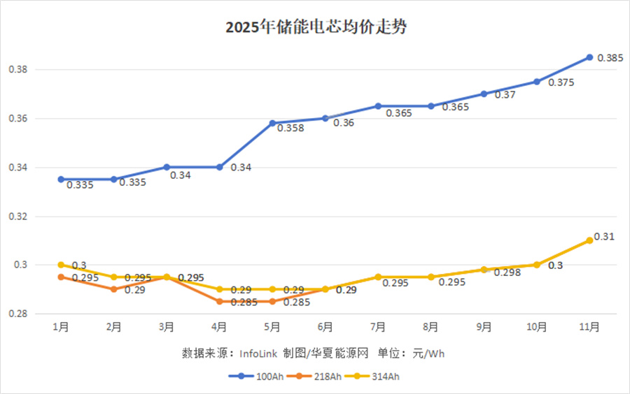 电芯环节处在材料环节的下游,也很早就开启了上涨行情。InfoLink数据显示,280Ah及314Ah储能电芯的均价,在5月触底后,6月小幅回升至0.29元/Wh,此后一路上行,10月站稳0.3元/Wh,截至11月20日,均价已升至0.31元/Wh。此外,100Ah储能电芯均价也出现了明显的上涨。