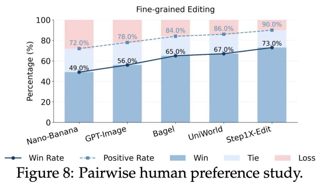 在包含 200 个样本的人类主观评测中,JarvisEvo在与Nano-Banana的对决中取得了49%的胜率(远超对手Nano Banana的28%),证明了其修图结果更符合人类审美 。