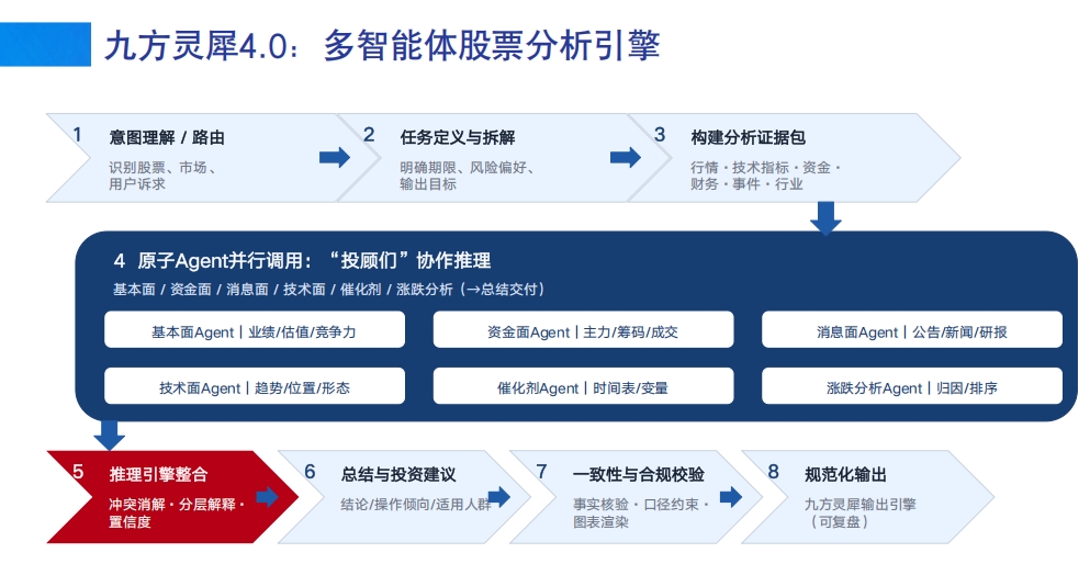 这一设计理念,与专业投资机构的前台运作模式较为类似。一个成熟的研究团队,往往有宏观策略、行业研究、量化分析、交易执行等角色各司其职,并使用不同的大模型底座(自研九章证券领域大模型以及行业中领先的商用化模型),通过交叉与协同,最终形成投资决策。九方灵犀4.0所采用的“多智能体工作流”技术,可看成是数字化地重构这一流程。