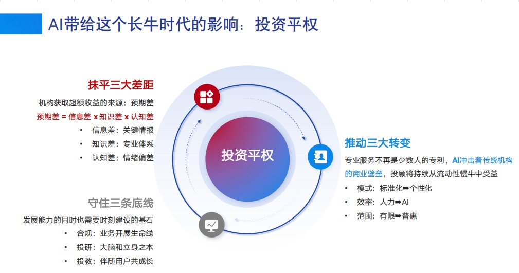从海量信息中提炼价值,从复杂数据中辅助决策,这既是当前投资者面临的挑战,也是智能投顾应用进化的阶段使命。当前市场中各类产品的探索,不仅为投资者提供了一个人人可有、人人会用的“私人分析师”,或也有望随着人工智能技术进一步突破,帮助普通投资者真正理解资本市场,优化投资决策,形成更理性的研究思维,真正助力“金融普惠”、“投资平权”。