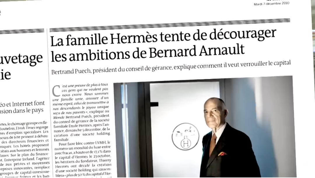 事情的背后却牵涉到了奢侈品行业的一场世纪收购大战:2010年10月,LVMH突然宣布它已经获得了爱马仕接近20%的股份,爱马仕家族则团结了52名家族成员,聚集起手里的股份启动了反击,赶走了门口的野蛮人。