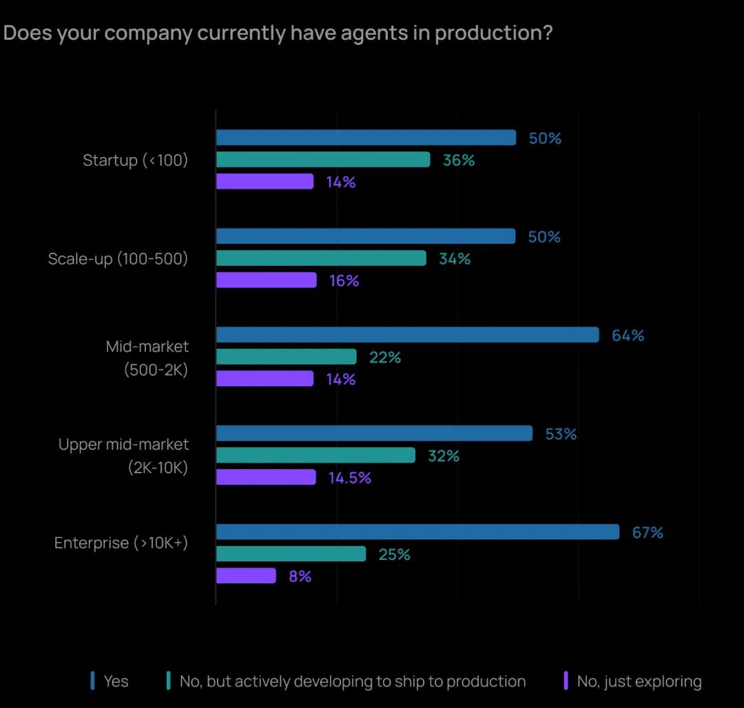硅谷的一家VC Menlo Ventures指出一个有趣的现象是,万人以上的大型企业中,已经有 67% 将 Agent 投入生产,24% 正在积极开发并计划部署;而在百人以下的小公司,这个比例是 50% 和 36%。这说明,大型企业凭借平台、安全和基础设施等方面的资源优势,能更快地将 Agent 从试验品变成稳定可靠的生产力工具。