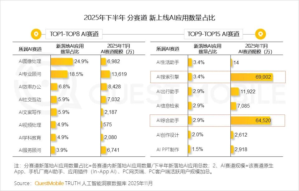 而国内应用目前处在第二梯队之间(ARR 1-10 亿元):垂类应用成主力,AI 编程 / 多模态 / 搜索落地最快垂类应用因场景明确、降本效果显著,成为商业化第二梯队的核心构成。