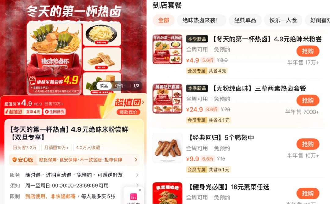 在抖音平台上,绝味鸭脖名为“【冬天的第一杯热卤】4.9元绝味米粉尝鲜【双旦专享】”的套餐,包含160克米粉+3颗鱼豆腐/2根海带结(2选1)+2片腐竹,原价为8.9元,团购价4.9元,有效期为2025年11月17日到2025年12月28日。