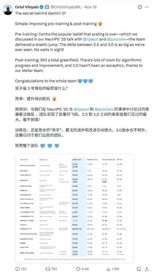 答案在发布当天就有了初步线索。Google DeepMind 研究与深度学习副总裁 Oriol Vinyals 直接在推特上“剧透”:“Gemini 3 这么强,核心秘诀就两点:更好的预训练,更好的后训练。”这番直白的表态,让“预训练”与“后训练”瞬间成为行业热议的核心话题。