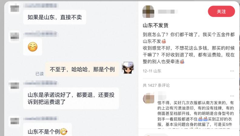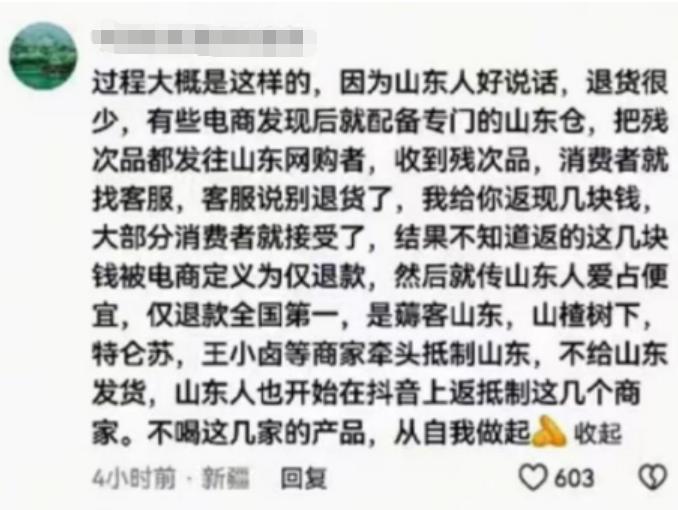 随后又有人传言,少数山东地区消费者滥用“仅退款”条款,一些商家会对山东区域进行拉黑。同时也出现了方向相反的传言:山东地区消费者好说话不退款,因此部分商家建立“AB仓”将次品发往山东。