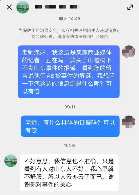 回到导致山楂树下事件爆发的截图,消费者在上述前提下询问客服,得到了“不发货”的回答。这个回复被视为山楂树下站队地域歧视的商家一方,背刺山东消费者的行为。
