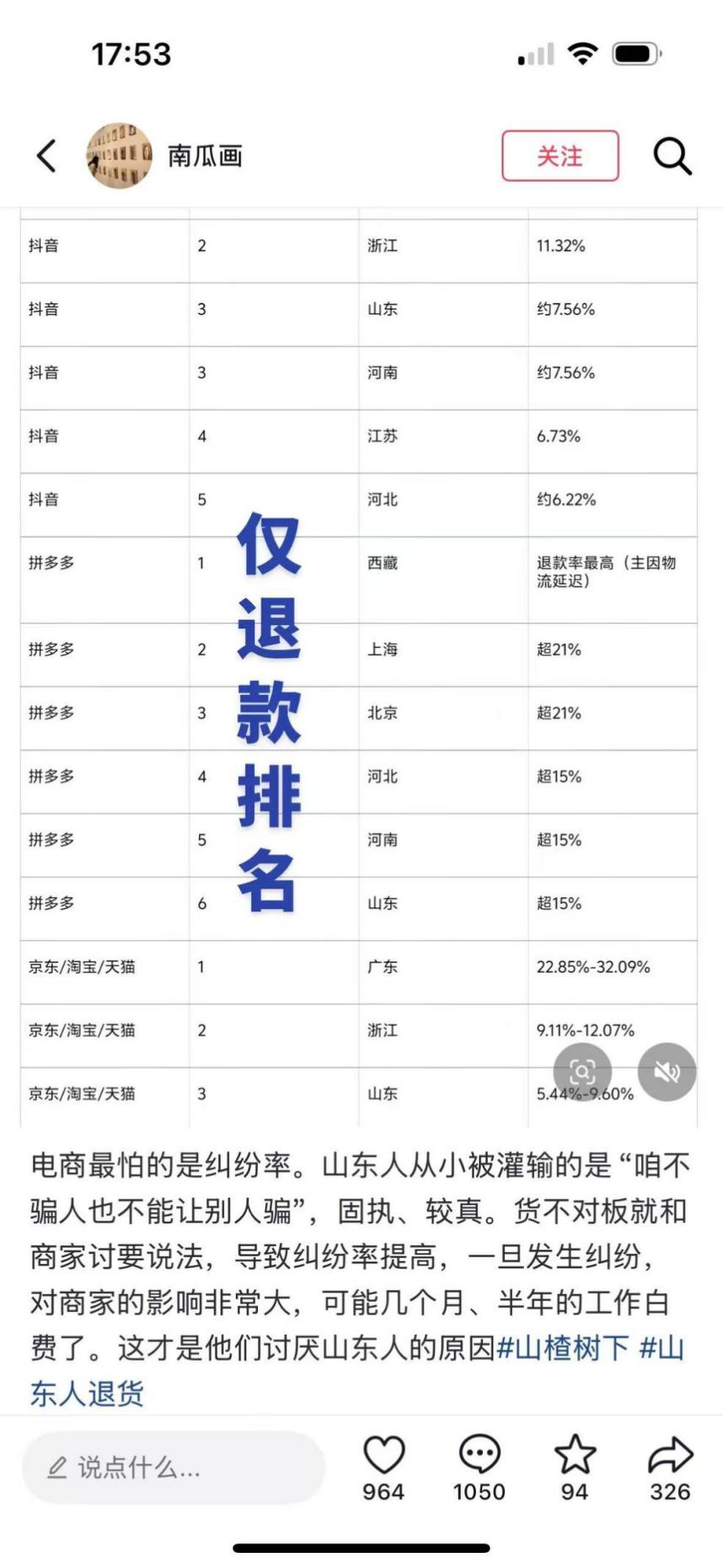 同时,部分商家客服被爆出地域攻击山东人退货率高爱占便宜,令无辜被牵连的山东网友大感愤慨。