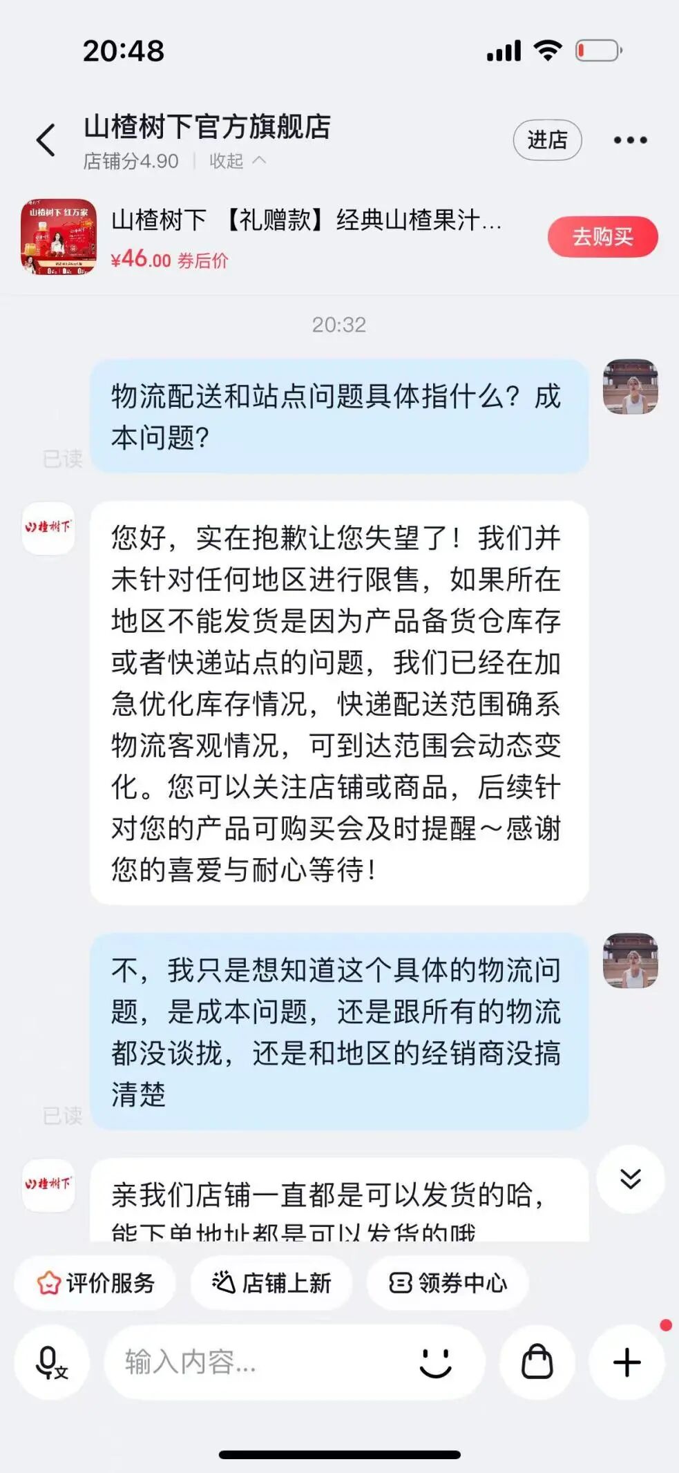客服或许没有权限透露敏感的供应链条细节,但对消费者而言,这样的处理方式很难接受:即使客服所说为真,所有山东网友也值得一个公开正式的解释,而不是私信追问才能要来的交代。