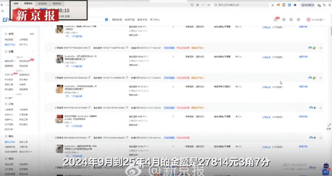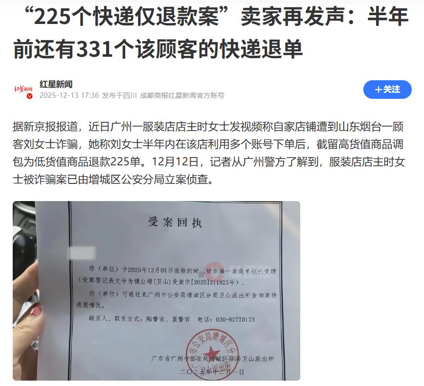 要理清这一事件的根源,或许还要追溯到不久前新京报报道的一起诈骗案:一服装店店主发视频称遭到山东烟台一顾客刘女士诈骗,她称对方半年内利用多个账号下单,调包为低货值商品并进行退款,共计225单。