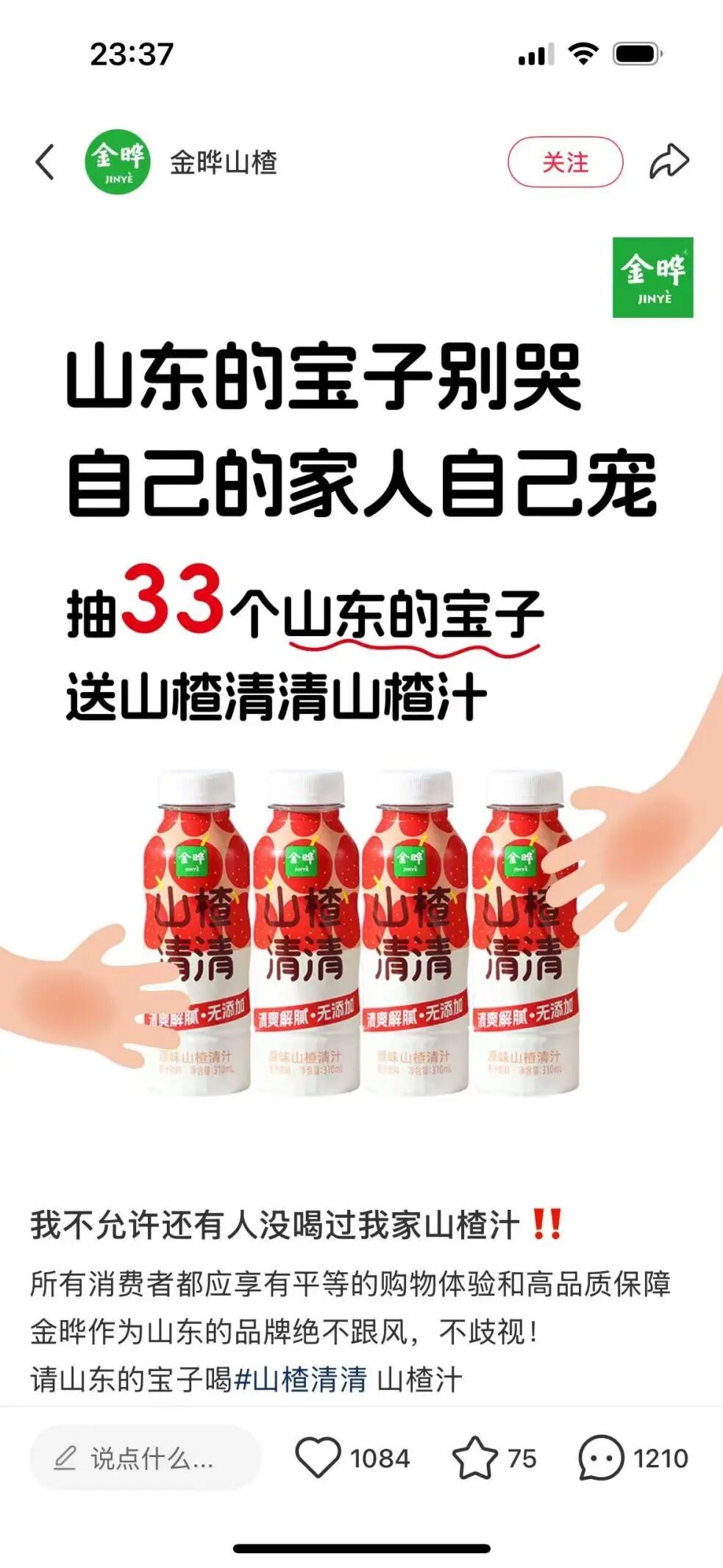 金晔在官方账号小红书@金晔山楂 上直接写出“山东的宝子别哭,自己的家人自己宠”等宣传语,请山东IP 的网友喝山楂汁,迫切地想要吃下山楂汁这个需求。