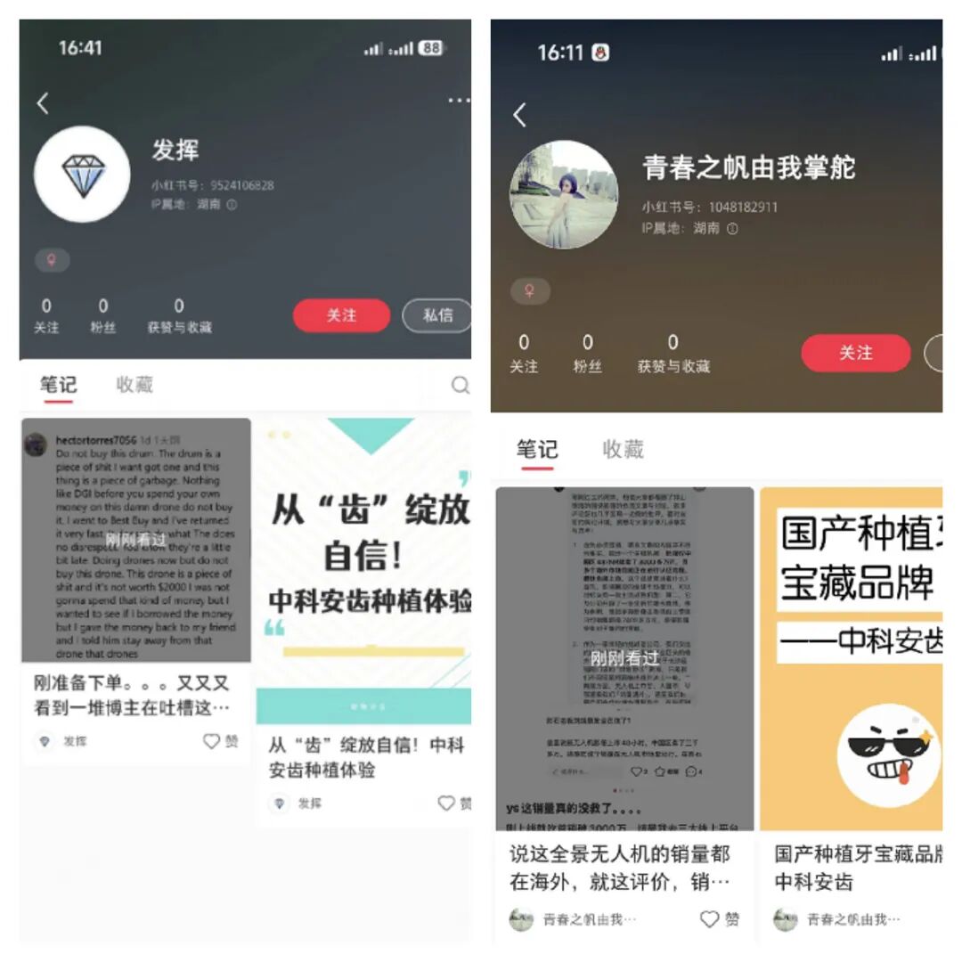 一方面,这些账号大多是0粉丝的“僵尸号”,出现了不少雷同的头像和评论。还有一些特征相似的账号,呈现出高度一致的发帖节奏,比如批量出现的宝妈号、追星号、种牙号等,上一篇帖子还在“不约而同”追星、种牙、美食探店,下一篇集体开始吐槽影石的产品性能。