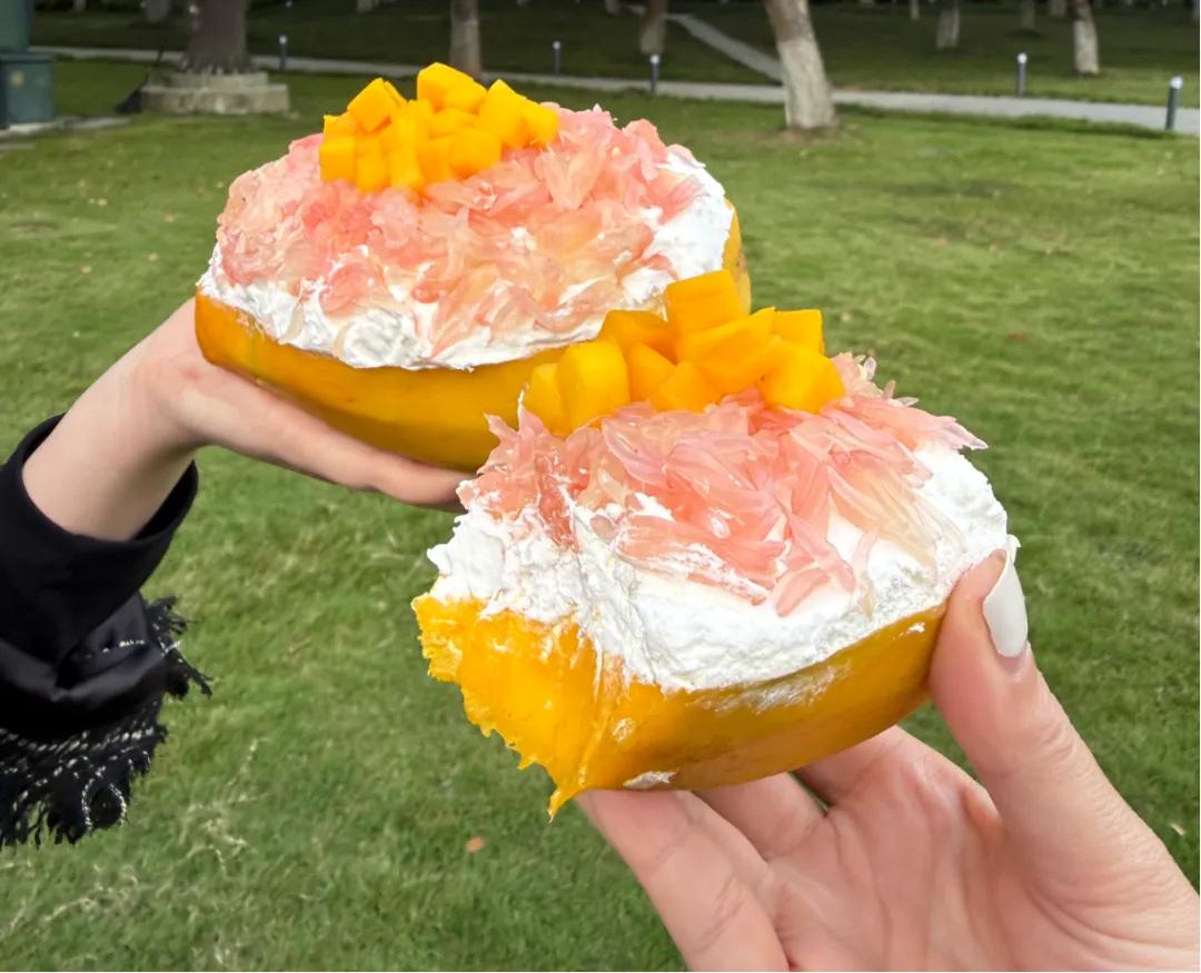 这款产品最初是网友把半个新鲜芒果涂抹上干噎酸奶,再撒上西柚粒、爆爆珠等制成,因简单好吃引发大量网友跟风复制。