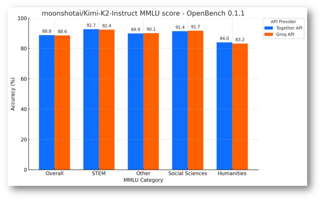 可靠性层面,根据开放式大模型评估框架OpenBench数据显示,Groq与基于英伟达GPU 的 API 提供商上Together AI 运行Kimi-K2-Instruct 模型的MMLU实例,结果表明,Groq的准确率更高,在STEM、Social Sciences等方面都比肩GPU AI Infra能力。