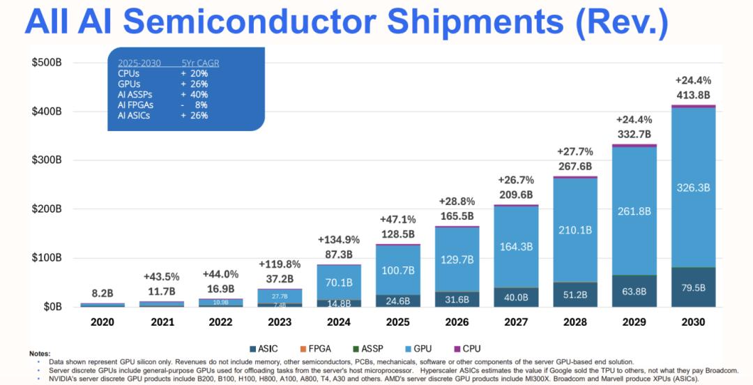 据国际数据公司(IDC)的最新数据显示,预计2025年,AI算力芯片市场规模超过1285亿美元,同比增长47.1%,预计2030年AI芯片市场规模达4138亿美元,其中,非GPU架构芯片市场规模占比超过21%,而推理芯片占比提升至65%。