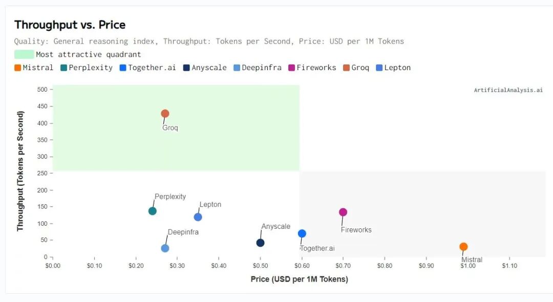 以开源Mixtral 8x7b开源模型为例,Groq 的吞吐量最高可达其他推理服务的 4 倍,Tokens处理速度比GPU更快,而价格却不到Mistral本身的三分之一。