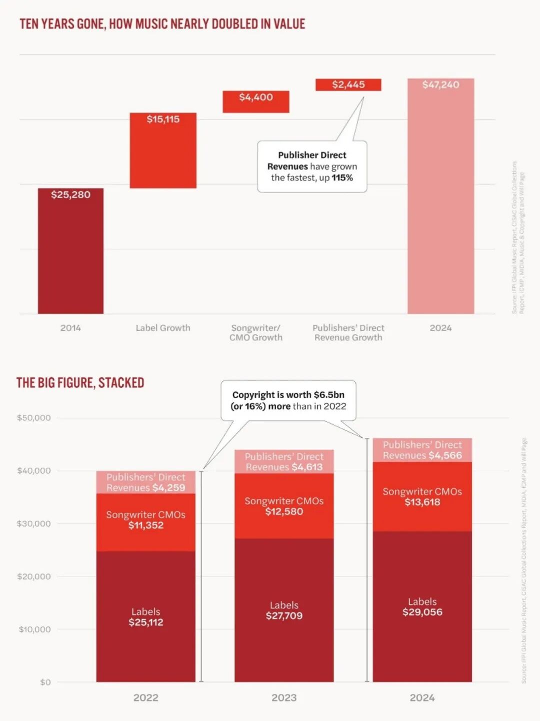 今年12月,音乐经济学家Will Page在其报告中指出,2024年全球音乐版权(包括录音和作品)的价值达到了历史新高,达472亿美元,比上一年增长23亿美元(5.2%)。其中290亿美元(占61%)来自录音版权(同比增长5%),136亿美元来自集体管理组织(同比增长8%),46亿美元来自直接版权商(同比下降1%)。词曲版权(作品版权)占总收入的39%。