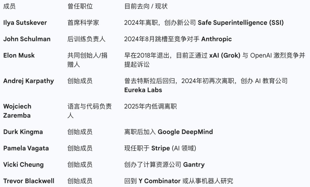 截至2025年12月,OpenAI最初的11人创始团队中,仅剩CEO奥特曼和总裁Greg Brockman两人仍坚守在管理层。
