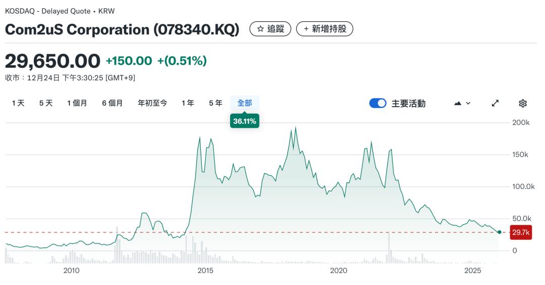 问题是,如果你查找 Com2uS 的相关资料,会发现这家公司在很长一段时间内都处于亏损状态,这几年股价更是倒退回了十年前。