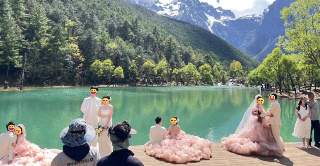 不少网友在社交平台上指出,来丽江拍婚纱照就像走进了菜市场,热门机位一米一个穿白纱的新娘,摄影师全程靠吼。“那个机位背后是玉龙雪山,旁边是湖泊,脚下是草地,所以特别受欢迎”,小鱼做了攻略发现,“其实那个湖特别看天气,很多网图全靠后期P。”