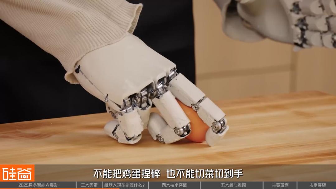 人手有27个关节,能感知压力、温度、质地。机器人的灵巧手通常只有15-22个关节,传感器也没那么精细。即使完美模仿人类的动作轨迹,效果也不同。人类能轻柔地拿起鸡蛋,机器人可能一用力就捏碎。
