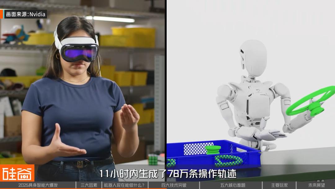 NVIDIA的解决方案是:用模拟器生成合成数据。他们展示过,11小时内生成78万条操作轨迹。相当于6500小时或连续九个月的人类演示数据。虽然合成数据和真实数据有差距,但至少解决了“数据荒”的燃眉之急。