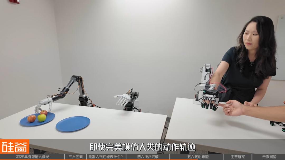 第一,人类的手和机器人的手,如果你想让它这个能力迁移得很好,需要做得非常接近。这也是为什么现在有好多人在做很灵巧的灵巧手,非常接近人的自由度,这件事本身是一件非常困难的事情。
