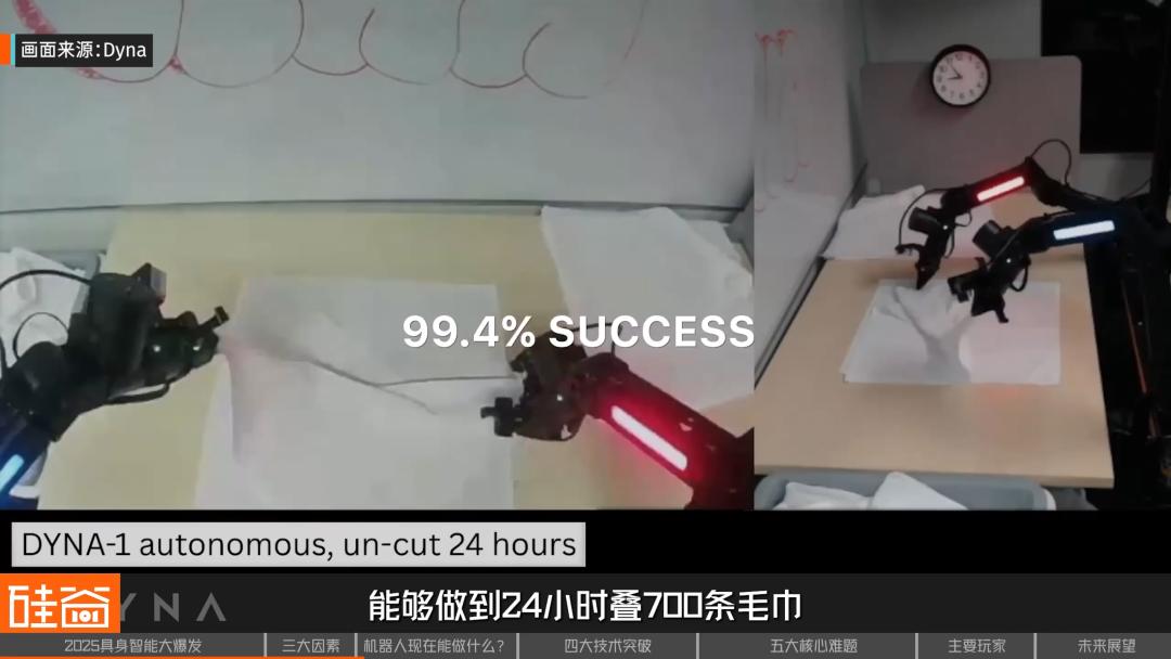叠毛巾、叠衣服,听起来简单,但Dyna的机器人能做到24小时叠700条毛巾,成功率99.4%。这在酒店、洗衣房已经是实打实的生产力。而且他们的基础模型里面包含了各种各样的场景数据,像切菜、切水果,准备食物,早餐清扫和物流分拣。