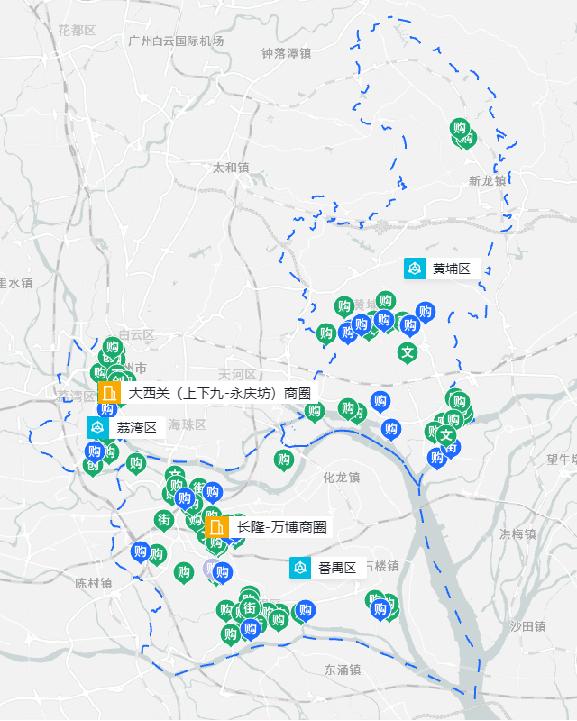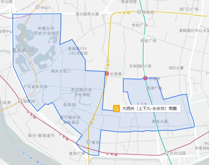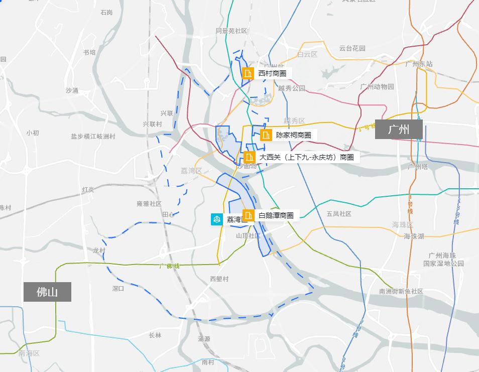 人口密集的荔湾、番禺已经孵化出两个市级商圈,分别是大西关(上下九-永庆坊)商圈、长隆-万博商圈。