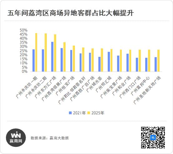 另一方面,荔湾正成为辐射广佛都市圈的重要消费目的地。在永庆坊等文旅商业的强力带动下,荔湾区商业的跨城吸引力持续增强,虹吸效应日益凸显。数据显示,近五年间荔湾区商场的异地客群占比已从22%显著提升至31%。