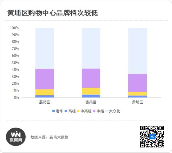 背后原因有三:第一,黄埔区的购物中心过于分散,缺少标杆项目,因此还未形成高粘性、高级次的核心商圈;第二,商场同质化严重,盒子式购物中心占比超过80%;第三,品牌档次较低,大众化品牌占比到达66%。