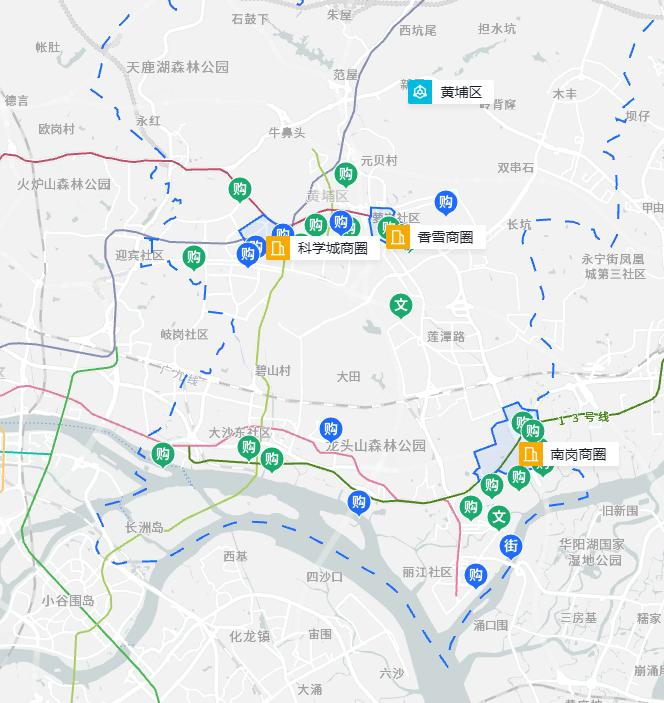 十多年前,黄埔区(以及原萝岗区)的规划重心在于产业园布局和基础路网建设上,商业配套主要服务于当时的产业人口,以社区底商和基本商业街为主。对于未来需要承载高端消费、体验式消费的大型综合性商业空间,在土地和规划层面没有预留足够空间。