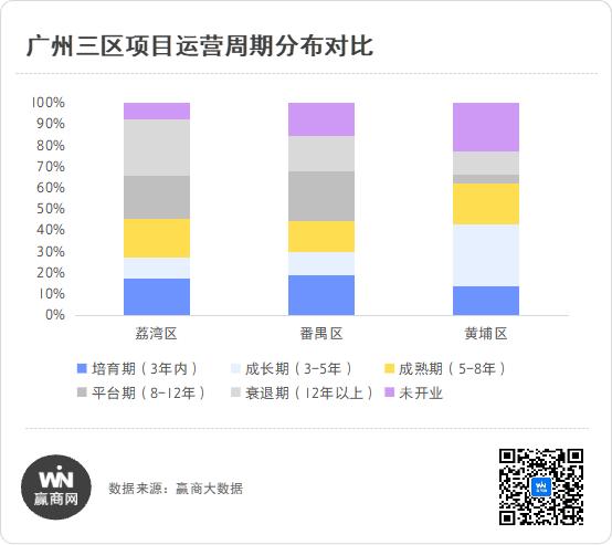 番禺区的项目特征则处于上述二者之间,不论是项目运营周期、业态类型还是项目体量,都处在一个相对平衡、健康的状态。