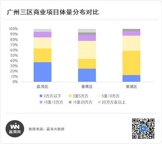 人口分布直接影响城市商业格局,上述三区商业规模在全市的站位与人口规模站位一致,商业项目集聚程度为荔湾>番禺>黄埔,荔湾最集聚、黄埔最分散。