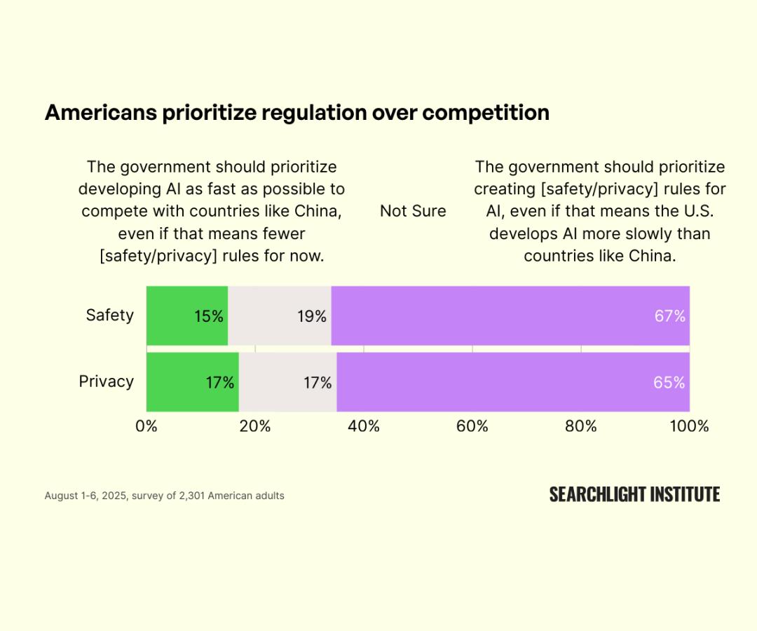 在涉及国际竞争的前提下,美国公众仍明显倾向于优先制定AI的安全与隐私规则。