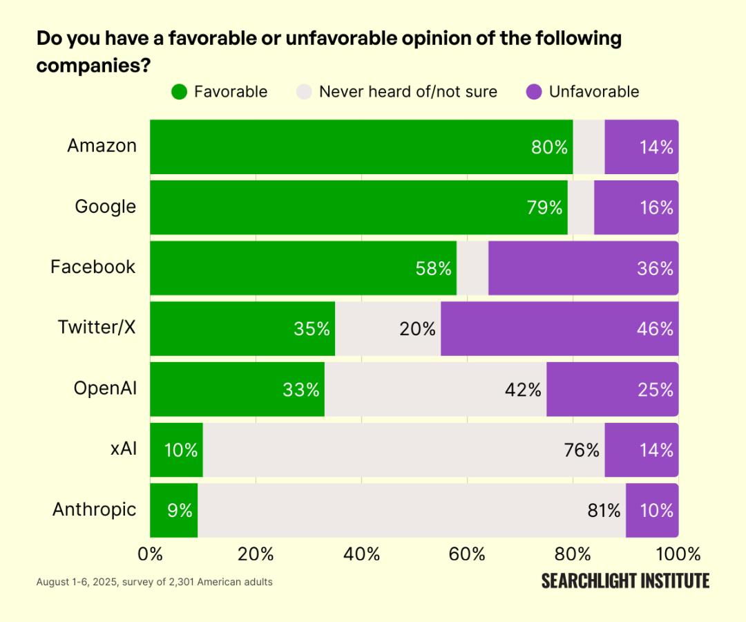 美国公众对主要科技公司的认知对比。与Google、Amazon等传统科技公司相比,AI公司仍处在大规模「认知空白」中。