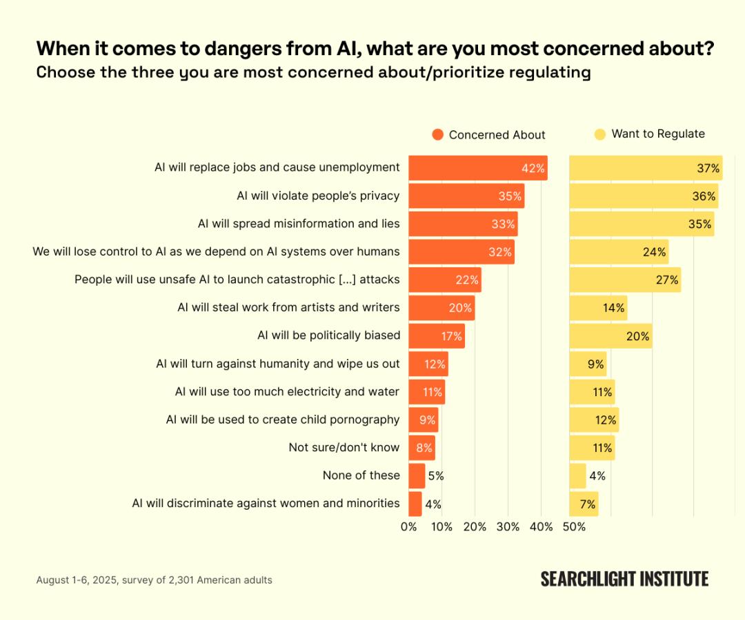 美国公众对AI风险的主要担忧及监管优先级。多数关注集中在就业、隐私与信息秩序等现实层面。