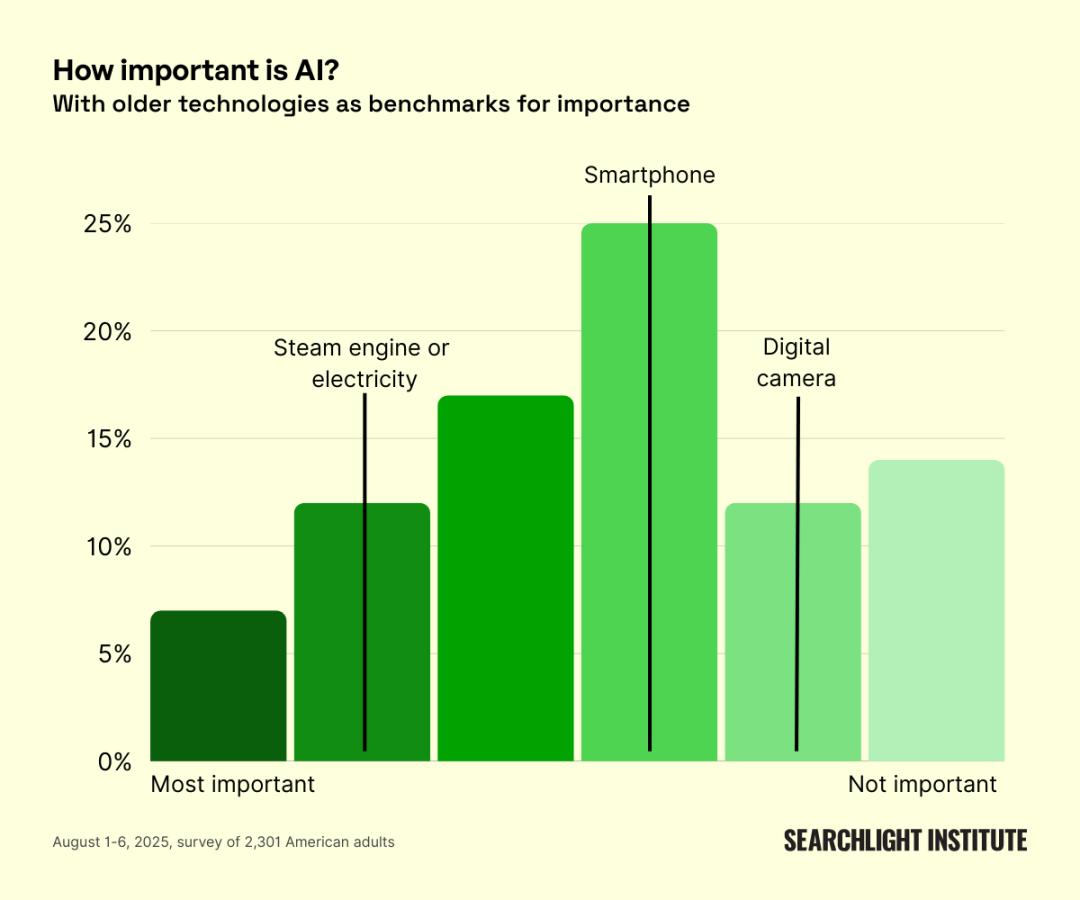 美国公众对AI重要性的判断。多数人将AI视为与智能手机相当的重要技术,而非蒸汽机、电力等「文明级」基础设施。
