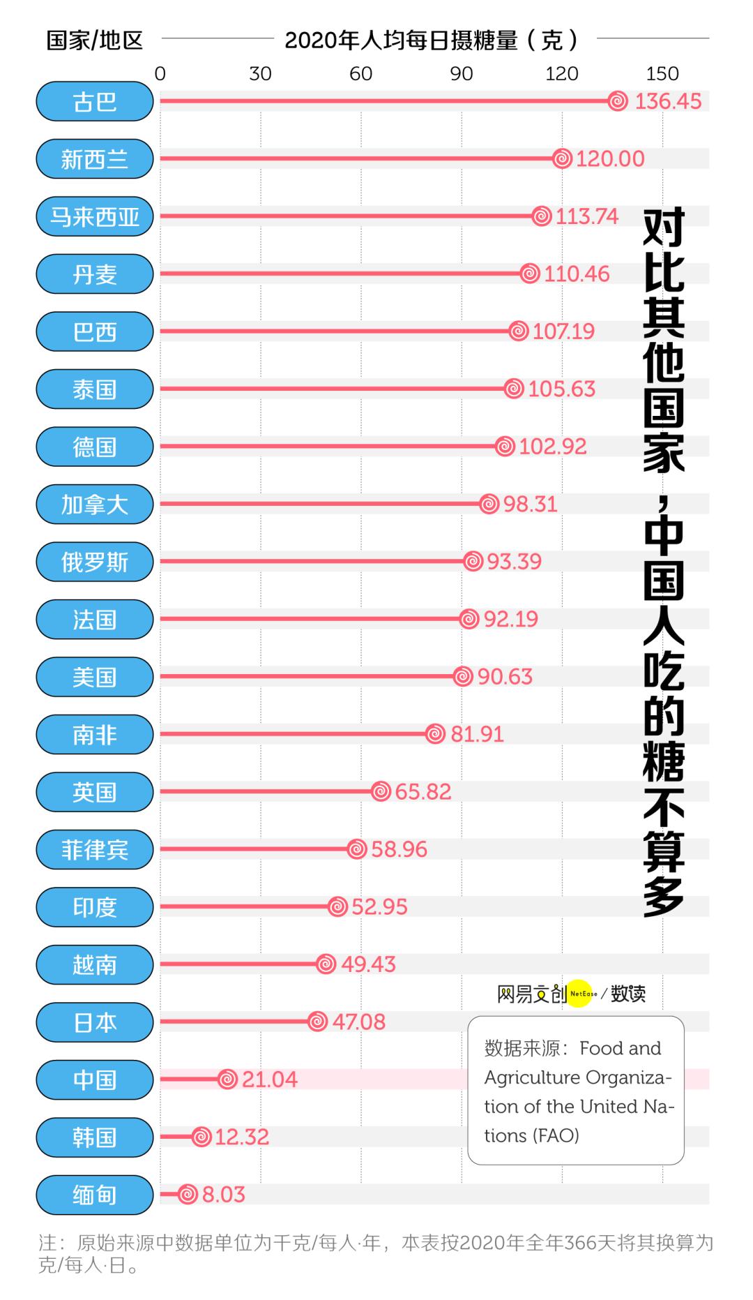 联合国粮食及农业组织的数据显示,2020 年,中国人均每日摄糖量 21 克,在全球排行中处在很靠后的位置。许多国家的这一数字都是中国的好几倍,远超世卫建议的摄入量。