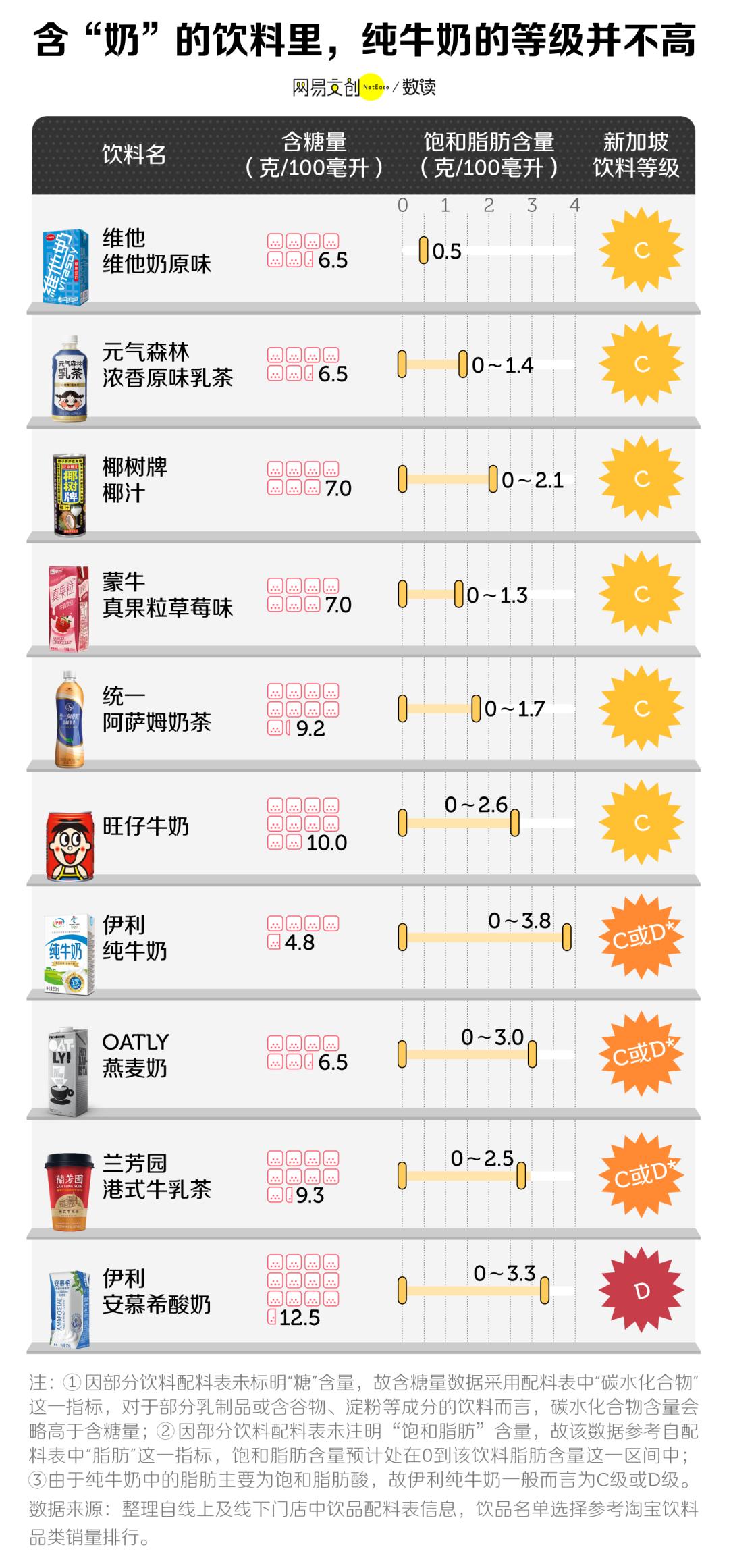 由于全脂牛奶会有饱和脂肪,这就导致其等级可能会落到 C 或 D 级,甚至比不上齁甜的瓶装奶茶。