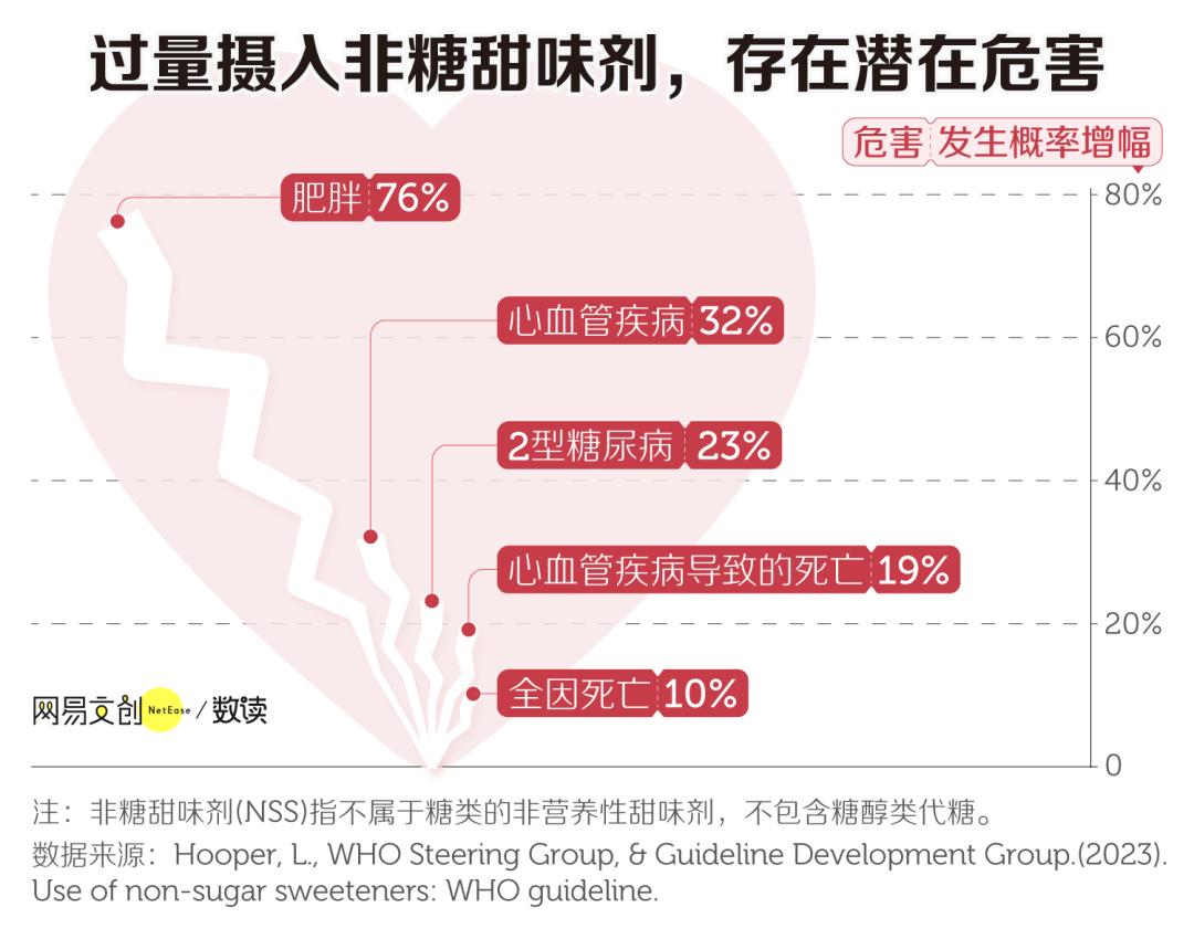 2023 年,世界卫生组织发布了关于非糖甜味剂(NSS)的新指南,引用了一项荟萃分析的结果,发现用代糖未必就能减肥,过量摄入非糖甜味剂反而会增加 76% 的肥胖风险。