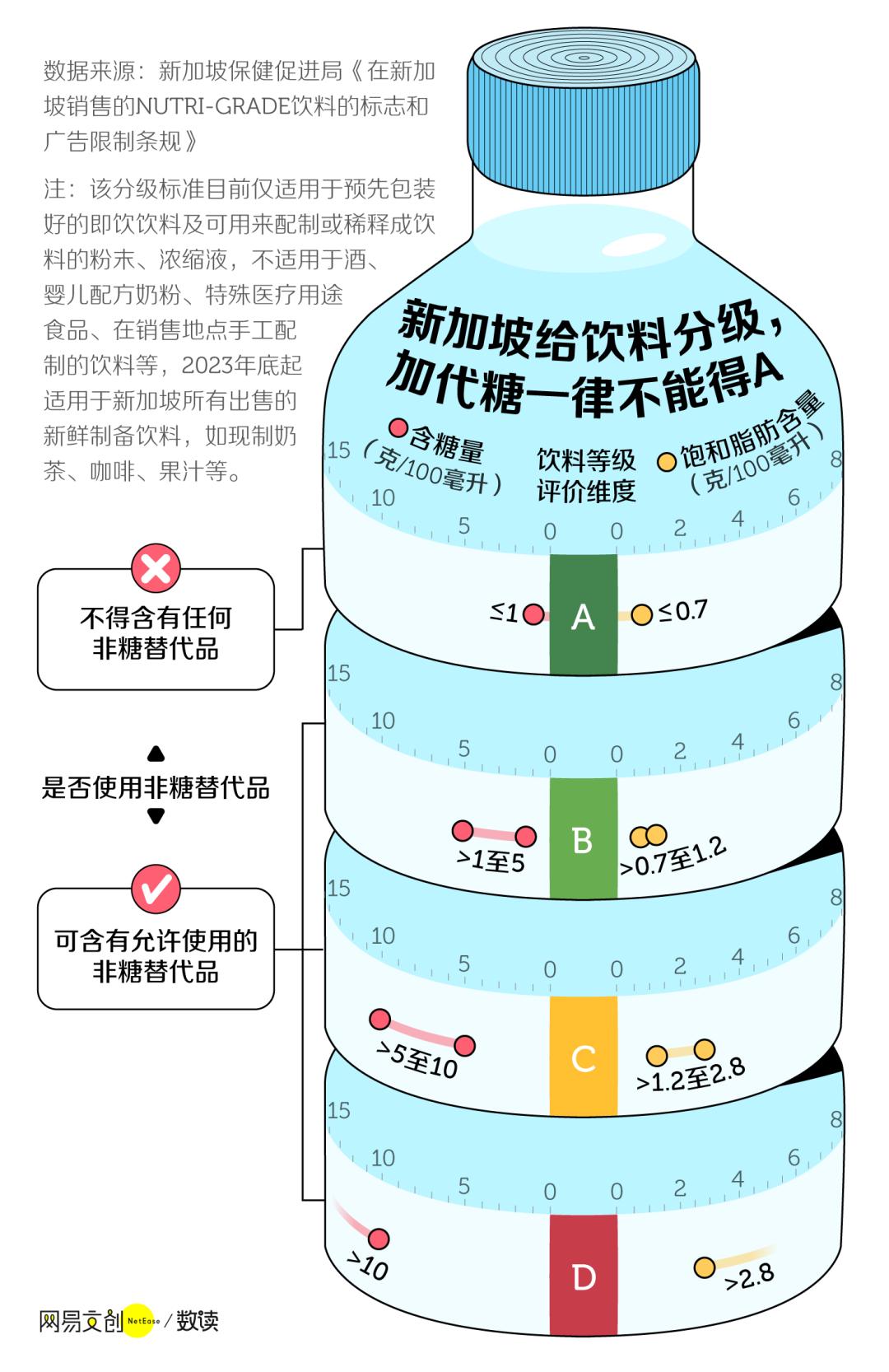 其实不止上海,早在 2022 年底,新加坡就执行了《食品条例(第2号修正案)》中的“史上最严”饮料分级制度,按含糖量等指标给包装饮料做分级。