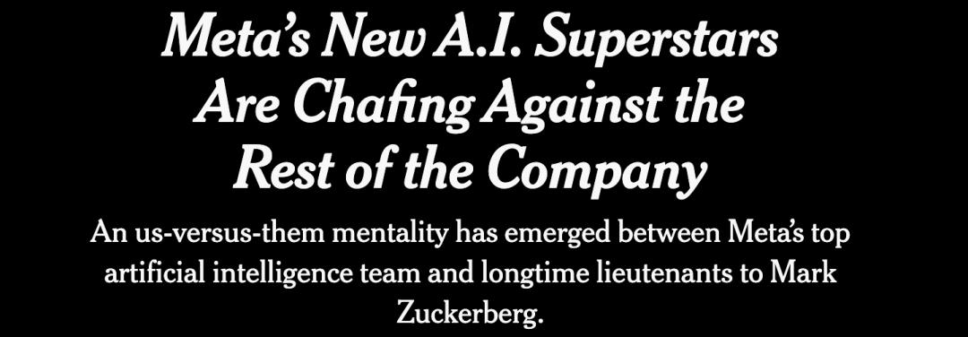 另据《纽约时报》报道,Alexandr Wang及其团队与扎克伯格的一些长期亲信(如首席产品官Chris Cox、首席技术官Andrew Bosworth)已经形成了一种「长期互相对抗」的心态。