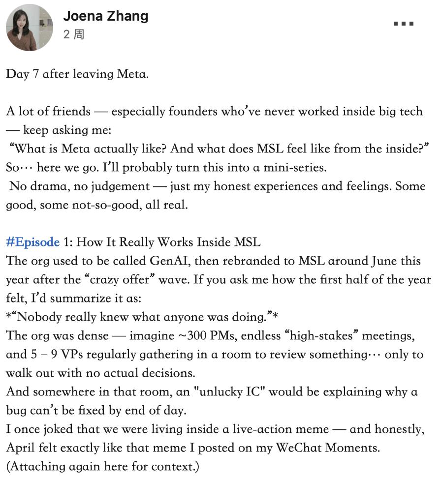 前MSL员工Joena Zhang在近日一篇LinkedIn帖子中爆料,今年上半年、当时仍叫GenAI的MSL内部,「几乎没人真正知道其他人在做什么」。