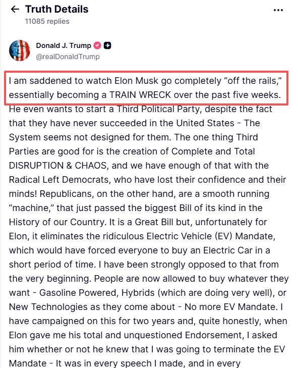 2025年夏季,马斯克和特朗普矛盾和冲突升级。7月,马斯克在 X 上发布多条措辞激烈的帖文,直接激怒了特朗普,他公开将其形容为“一场彻头彻尾的脱轨灾难”,双方关系彻底破裂。