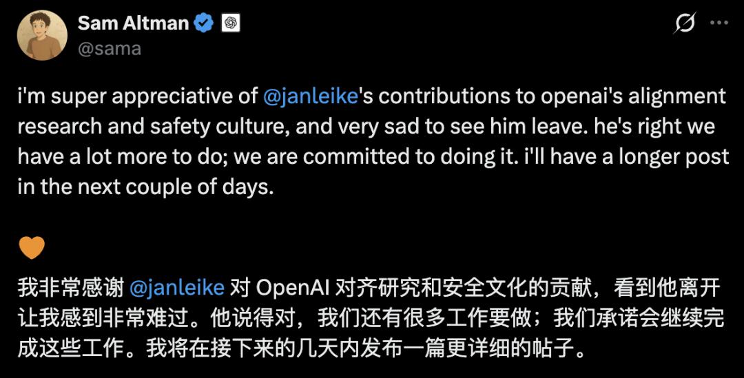 当时奥特曼就Leike的发帖回复,认为他说的对:「我们还有很多事情要做;我们承诺会去做」。